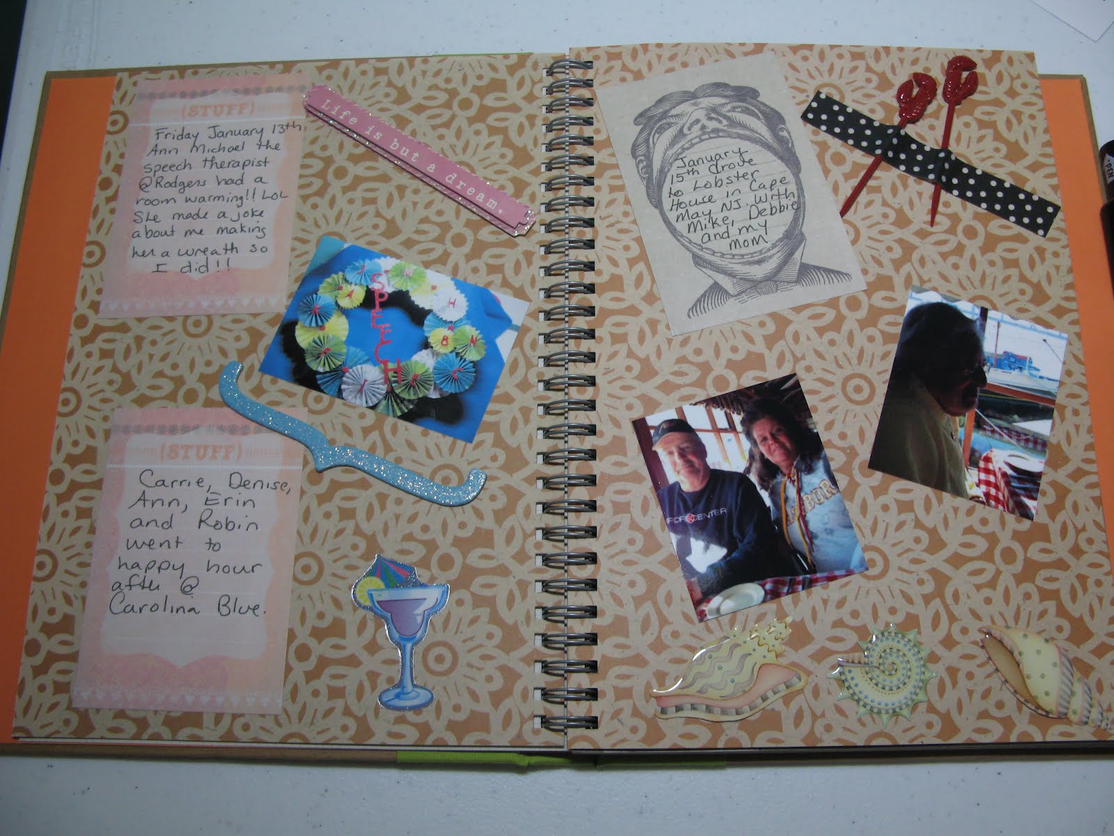 Okay my New Years resolution was to make sure I spend more time having fun! I tend to be a homebody and I get caught up in always making sure all my chores are done BEFORE I do anything fun. If my friends passing this last fall taught me nothing else is that everyday is a gift to be enjoyed and that the dust bunnies will be there tomorrow. So I am journaling my fun outings and what evers in a smash book for 2012. No fancy scrapbook pages just notes and pictures or programs to document. I got to use my photoshop elements to size down the pictures that I put in here. The other neat thing is I have an according file box of stickers from when I first started scrapping. I rarely use stickers anymore and this is a perfect way to use them and not let them go to waste!